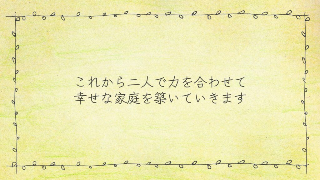 淡いイエローと優しいイラスト背景が、披露宴のラストシーンを温かく包み込みます。