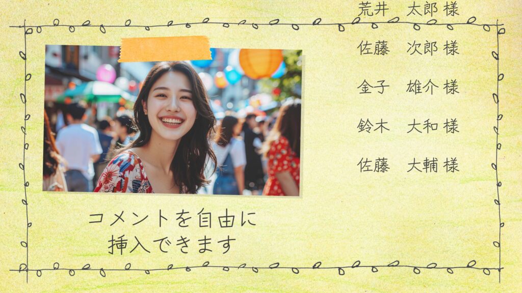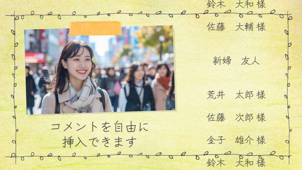 このテンプレートなら、登録したゲストの人数(名簿の長さ)に合わせて、文字が流れるスピードをシステムが自動で最適化します。