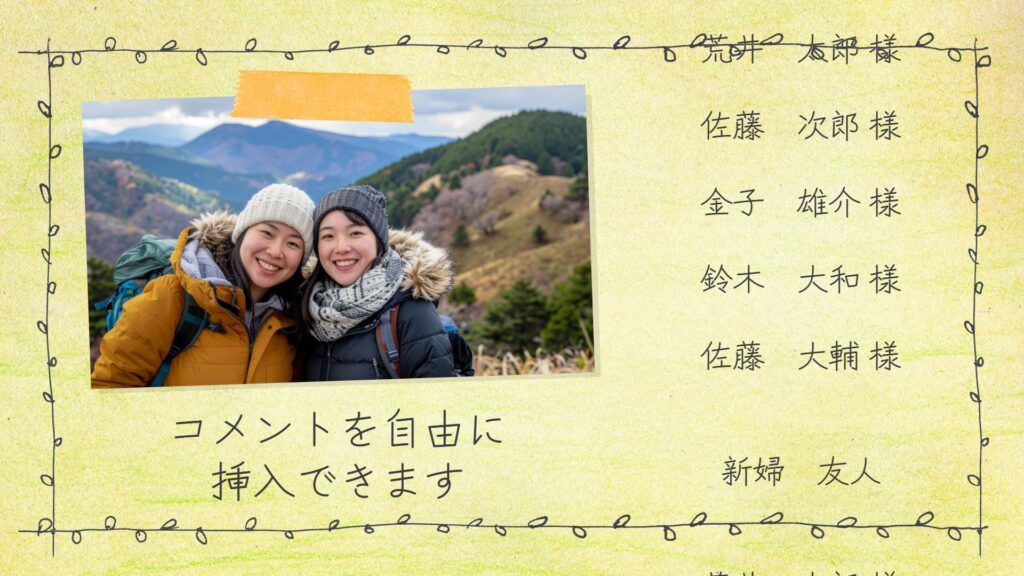 自分との思い出写真にメッセージが添えられているのを見たゲストは、きっと温かい気持ちになるはずです。