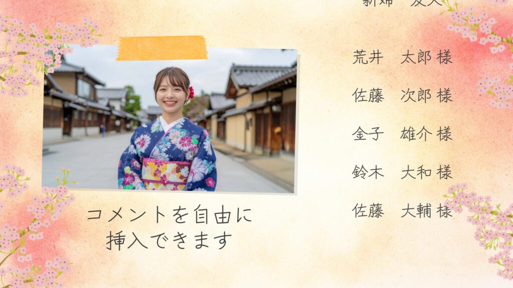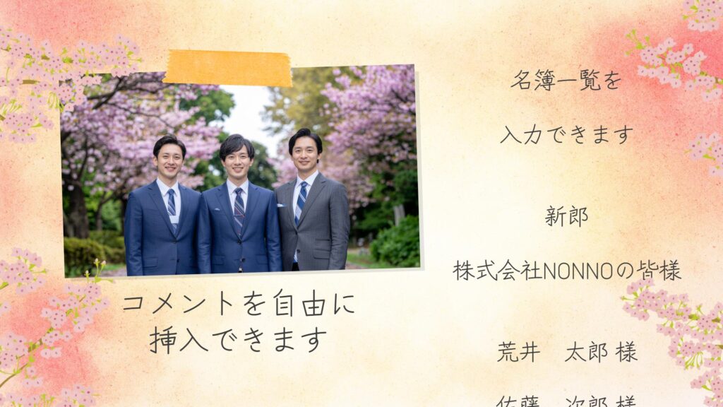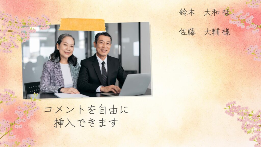 それぞれの写真にコメントを添えることで、「来てくれてありがとう」「これからもよろしく」といった感謝の気持ちを、桜の風景に乗せて一人ひとりに届けることができます。