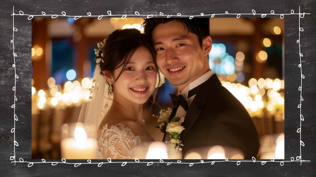 黒板に文字を描いていくアニメーションから始まり、中盤でたくさんの写真で二人の人となりを紹介、最後はゲストへの歓迎メッセージで締める。